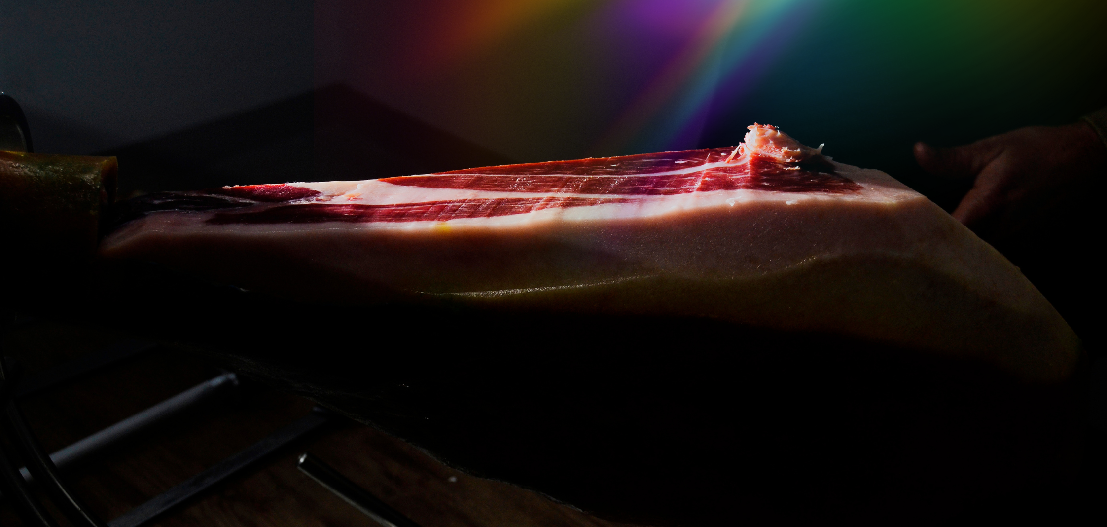 Cuando la luz incide desde unos ángulos concretos, se produce este famoso arcoíris multicolor. Aunque pueda parecer un aspecto negativo de la pieza, no lo es, porque no afecta ni a la calidad ni al sabor del jamón ibérico.