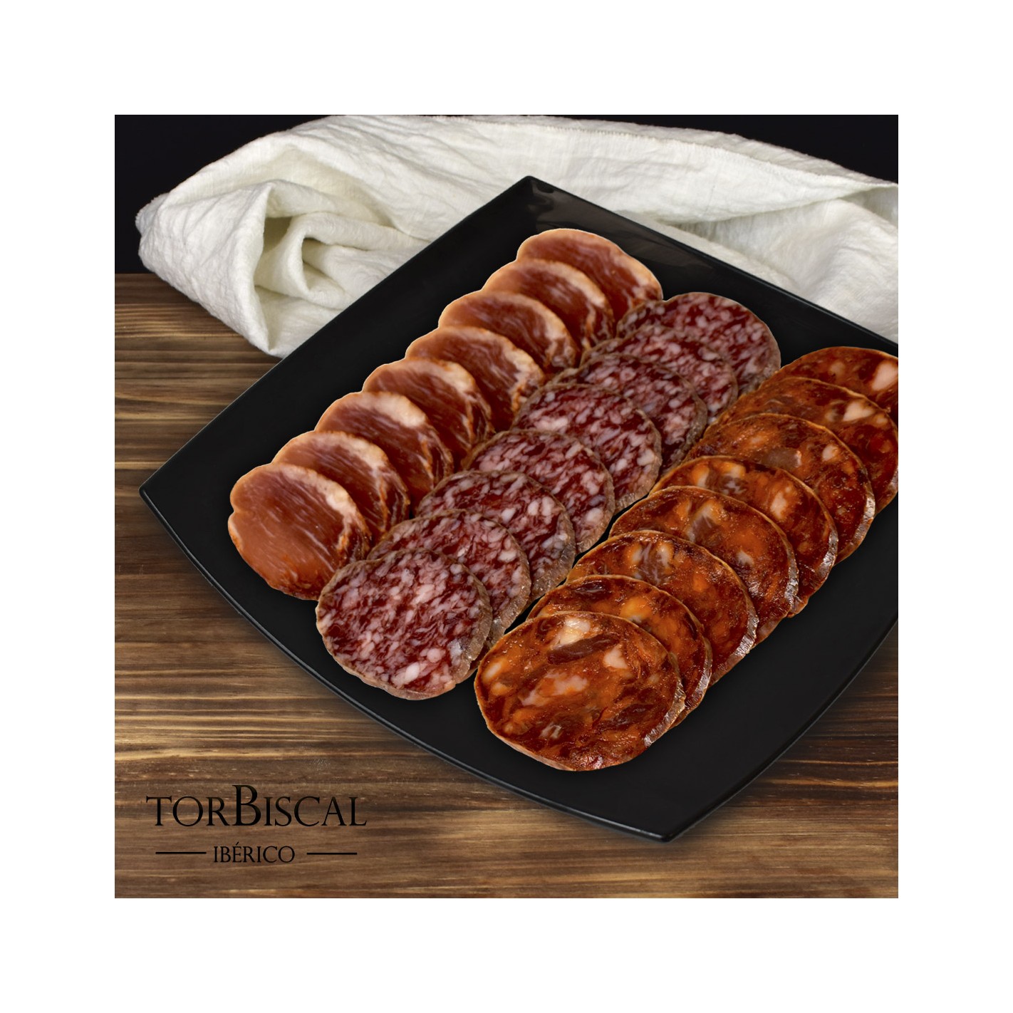 TORBISCAL SELECCIÓN loncheado de jamón bellota ibérico 50% raza ibérica corte cuchillo + lomo bellota ibérico 50% raza ibérica + chorizo ibérico bellota + salchichón ibérico bellota.